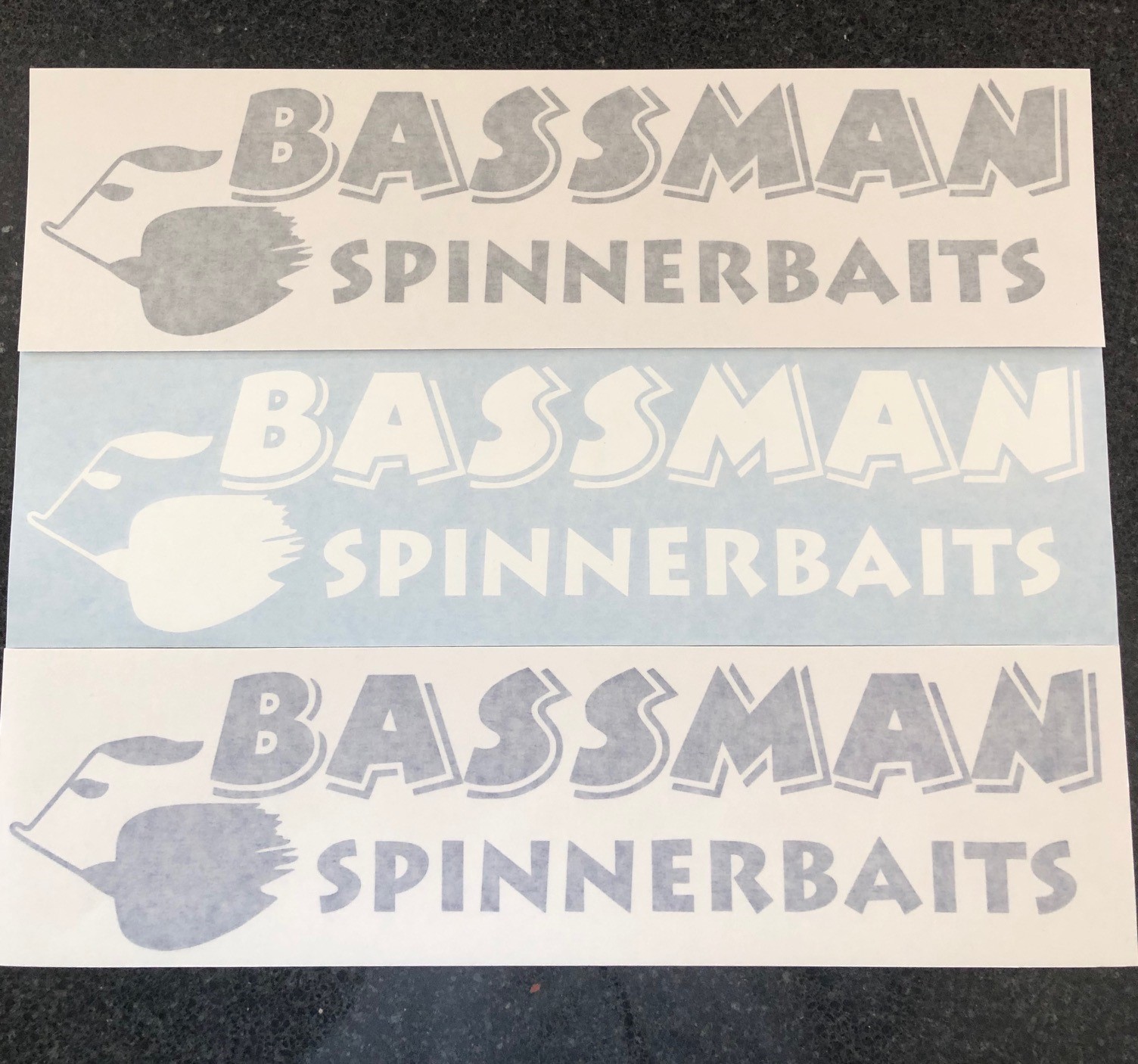 Bassman Spinnerbaits Boat stickers – 470mm x 125 mm available in three colours Black , Blue or White